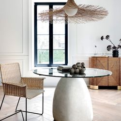 Cb2 Stone Concrete Dining Table Base With Brass Arms 47" Round Glass Top $500Biscayne Park, FL