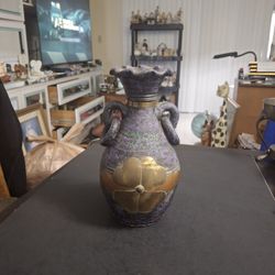 Mexican Terracotta Pottery Vase, Purple Sand Textured Finish& Applied Brass Flower W/Age Related Patina - Handles On Side Scalloped Edges 10" Tall $15North Lauderdale, FL