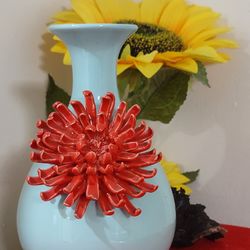 9" Anthropologie Chrysanthemum Flower Vase: Celedon Blue with Red Applied Pottery Flower.$45Miami, FL