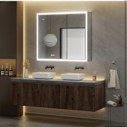New in Box QueenFan 36x30 Lighted Medicine Cabinet with Mirror & Clock - Surface or Recessed Aluminum Medicine Cabinet with Dimmable Light & Outlet, A$280Oakland Park, FL