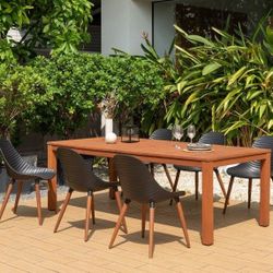 BRAND NEW 84” x 40” Hard Wood Dining Table with Polypropylene All weather Top and (6) Recycled Resin Chairs