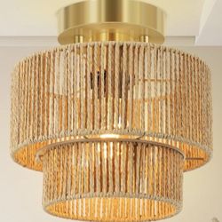 BoostArea 8.66” Boho 2-Tier Rattan Ceiling Light Fixture, Semi Flush Mount Woven Chandelier for Bedroom, Dining Room, Kitchen, Entryway, Living Room(B$20Medley, FL