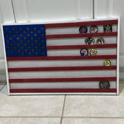Handcrafted Wooden American Flag Challenge Coins Holder 24” x 15.5” x 1”. It holds 60 to 70 coins depending on sizes. The right side of the frame as m$160Boca Raton, FL