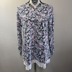 Kim Rogers Women's Tunic Top Blouse Size M Long Roll Tab Sleeve Crocheted Trim$14Naples, FL