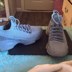 Steve Madden Women's Maxima sneakers in a monochromatic blue shade, featuring a knit upper, rhinestone embellishments on the side, and a chunky sole. $50Tampa, FL