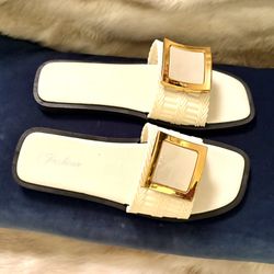 These are women's flat summer sandals with a decorative gold buckle and a textured white band.$18Miami, FL