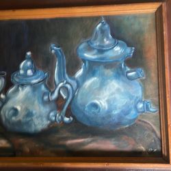 Oil painting-original work-still life-framed-vintage-2 antique silver teapots$98Boca Raton, FL