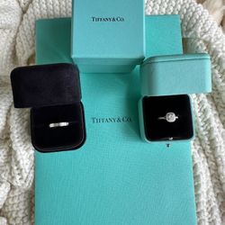 Tiffany & Co engagement and wedding band platinum rings with diamonds. Engagement "Soleste" double halo ring cushion cut .27ct. Sizes 5.5$6,000Hollywood, FL