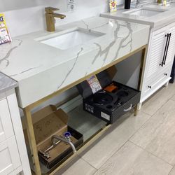 48” Bathroom Vanity Cabinet New Polished Brass Frame With Glass Shelf Quartz Countertop Ceramic Sink Attached Ready For Pick Up Today$899Miami, FL