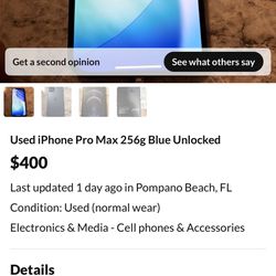 Used iPhone Pro Max 256g Blue Unlocked$400Pompano Beach, FL