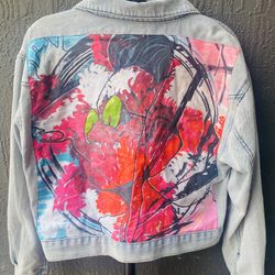 jean jacket with feathers on the neck and wrists Size S$15Miami, FL