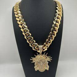 👑Premium Quality👑 20mm - 24inch Gold Plated Miami Cuban Link & Jesus Thorn Crown Pendant 2 Piece$400Pompano Beach, FL