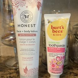 Set of 2 -honest face & body lotion•sweet almond•8.5oz•Burt’s bees fluoride free toothpaste kids•$10$10Orange Park, FL