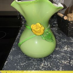 NEW condition vintage art glass vase featuring a bright green body with a ruffled white-cased interior, decorated with an applied yellow flower and gr$50Sanford, FL