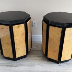 Circa 1980's Henredon Black Lacquer and Burlwood Octagon Drum End Side Tables With Storage$495Orlando, FL