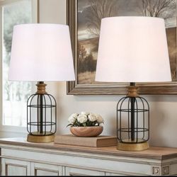 Set Of Two 21” Farmhouse Black Metal Cage Table Lamps with Wood Accents and White Fabric Lamp Shades $42Palm Shores, FL