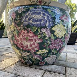 Asian Chinese Chinoiserie Oriental Geisha Girl Koi Fish flower pot planter. Hand Painted Rose Medallion 10" tall X 12" Diameter. $90Boca Raton, FL