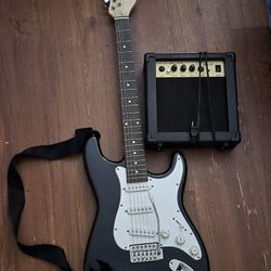 Fender electric guitar and Squier Strat Fender and speaker/amplifier and a bag with accessories.$245Delray Beach, FL