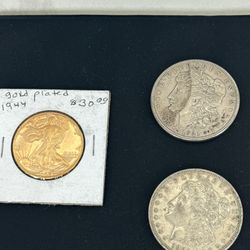 Morgan Silver Dollars And A Gold Plated Walking Liberty Half Dollar $195Hobe Sound, FL