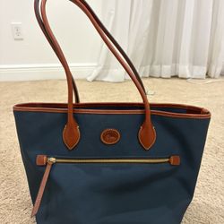 Dooney & Bourke Nylon Tote Navy Blue Brown Leather Trim Zip Top Bag Red Lining$130Lake Worth, FL
