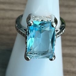 Elegant silver ring featuring a striking aquamarine blue emerald-cut center stone. The blue color offers bright, eye-catching sparkle. Sleek silver se$30Land O' Lakes, FL