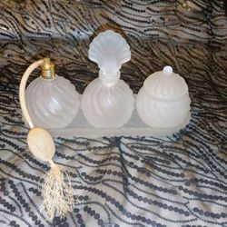 Vintage 1970s Frosted Glass Perfume Bottle Atomizer Set With Frosted Glass Tray And Storage Jars.$20Seminole, FL