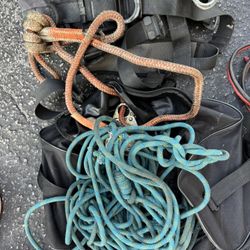 collection of rock climbing gear, including a harness, various ropes, and safety hardware such as carabiners$30Miami, FL
