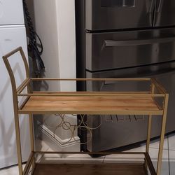 FirsTime & Co. Francesca Bar Cart Model ,featuring a gold metal frame, wood shelves, and bottle/glass.$65Miami, FL