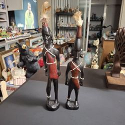 Hand-carved Wooden Figurines Of An African Tribal Man & Woman W/Solid Darkwood W/Beads & Feathers, Folk Art Kenya 12"H Set Of 2$25Fort Lauderdale, FL