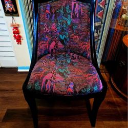Vintage custom maximalist design accent chair characterized by vibrant, psychedelic patterns and bold colors on a dark-finished wooden frame. $125Boca Raton, FL