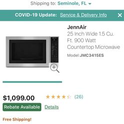 JennAir JMC3415ES 25 Inch Wide 1.5 Cu. Ft. 900 Watt Countertop Microwave$800Largo, FL