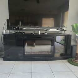 dark brown wooden media console or TV stand featuring glass-front cabinets and central open shelving.$70Hollywood, FL