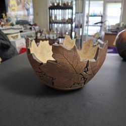 Handmade Pottery Bowl Overlapping Maple Leaves Unique Rim, Textured Matte Brown Exterior & Speckled Tan Glazed Interior Etched Signature On Bottom $55Fort Lauderdale, FL