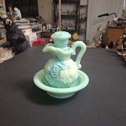 Avon "Victoriana" Jadeite Green Slag Glass Marbled Teal & White, Victorian Rose Motif Pitcher And Bowl Set Vintage 70's & 80's $20Fort Lauderdale, FL