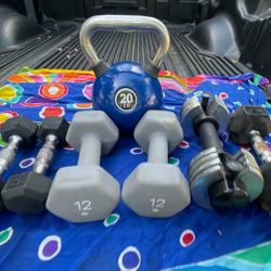 VARIETY OF DUMBBELLS (PAIRS OF) : 5s & 12s /SINGLE RUBBER 10lb. / SINGLE 10 LB. ADJUSTABLE & 20 LB. KETTLEBELL. °. *. °. will sell individually$75Deerfield Beach, FL