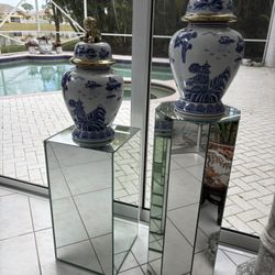 2 Mirrored Cube Display Tables For Statue, Sculpture, Lamp, Plant 24.5”HX12” Square & 30.5”x11.5” Mirror Pedestal For MCM, Z Gallerie, Antiques, Etc. $200Boca Raton, FL