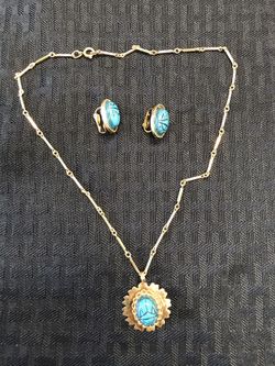 Gold tone and turquoise like stone necklace and matching earrings.$35Miami Beach, FL