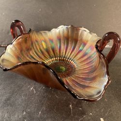 FENTON Vintage Amethyst Strippled Rays Carnival Glass Handled Candy/Trinket Dish (Length: 6-1/4”)$40Dade City, FL