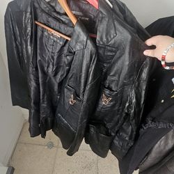 Women’s size medium leather jacket, crop top style inside is a black red and white mini skirt with a slit up the side also a size medium$32Lutz, FL