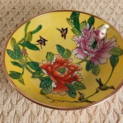 Antique Yellow Floral Butterfly Birds Asian Brass Encased Decor Hanging Bowl 6"$22Ocean Brz Pk, FL