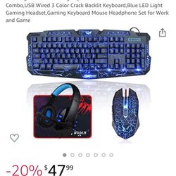 BlueFinger Backlit Gaming Keyboard and Mouse and LED Headset Combo,USB Wired 3 Color Crack Backlit Keyboard,Blue LED Light Gaming Headset $30Port St. Lucie, FL