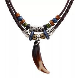 Men's Leather Necklace Wolf Tooth Wood Beads Beaded Tribal Style Amulet Necklace $13Port St. Lucie, FL