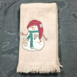 Vtg Christmas Fingertip Hand Towel Cream Fringe Snowman Holiday Home Linen $5Ocean Brz Pk, FL