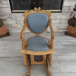 This is a vintage wooden rocking chair with a blue cushion$50Vlg Wellingtn, FL