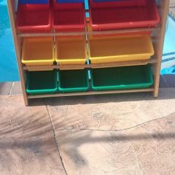 X12 plastic colorful organizer storage bin & wood rack shoes toys kitchen goods pool deck garden $99Pompano Beach, FL
