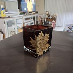 Teleflora Gift Dark Amber Cube Vase W/Gold Maple Leaf Design Cased In Heavy Clear Glass Candle Holder 4.5"H X 4" Sq$7Fort Lauderdale, FL