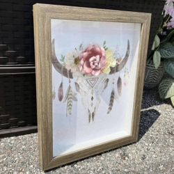 Wood Framed Boho Southwestern Flower Feather Cow Skull Picture Hanging Wall Art Home Decor 14x11”$15Plant City, FL