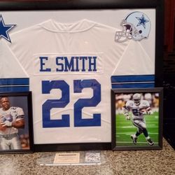 EMMITT SMITH HOF, WITH THE DALLAS COWBOYS, STITCHED, FRAMED JERSEY, SIGNED PICTURE,COA,TRADING CARD.$175Wimauma, FL