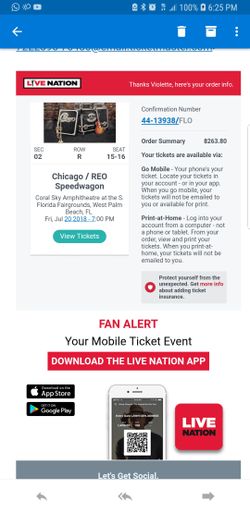 Reo speedwagon and Chicago tickets$263West Palm Beach, FL