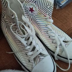 This is a Converse Chuck Taylor All Star High Metallic Exploding Star sneaker in white with a metallic rainbow geometric pattern. Women's! Size 10$45Lake Worth, FL
